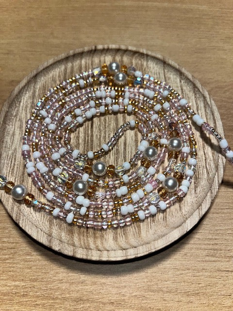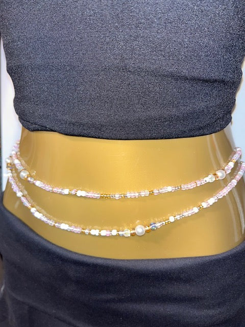 Beautifully hand strung glass, crystal, and iridescent cake beads in a variety of colors with simulated pearl beads. Adorn your waist today with Boujee Baby!