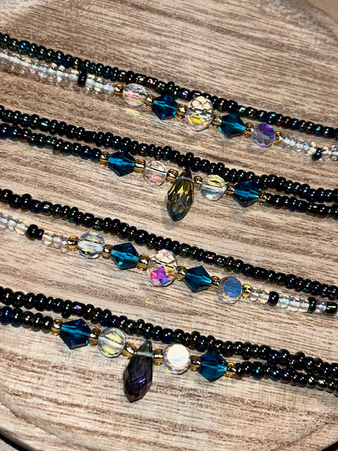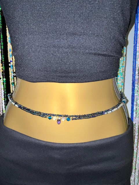 Dark Angel! Beautiful, double strand, hand strung glass beads, and crystal beads in black and white iridescent, and glass crystal beads in a smokey teardrop and deep turquoise round. Adorn your waist today with Dark Angel!