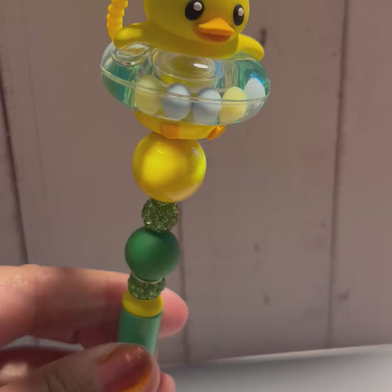 Hand Beaded Rubber Ducky Pen! Yellow and green, with silicone keychain hook on top! Inner tube has floating features! Our beautiful selection of hand-beaded pens are made with quality materials and are very durable. Colors and selections may vary. Each pen comes pre-filled with black ink. You will receive one extra black ink refill for the future.