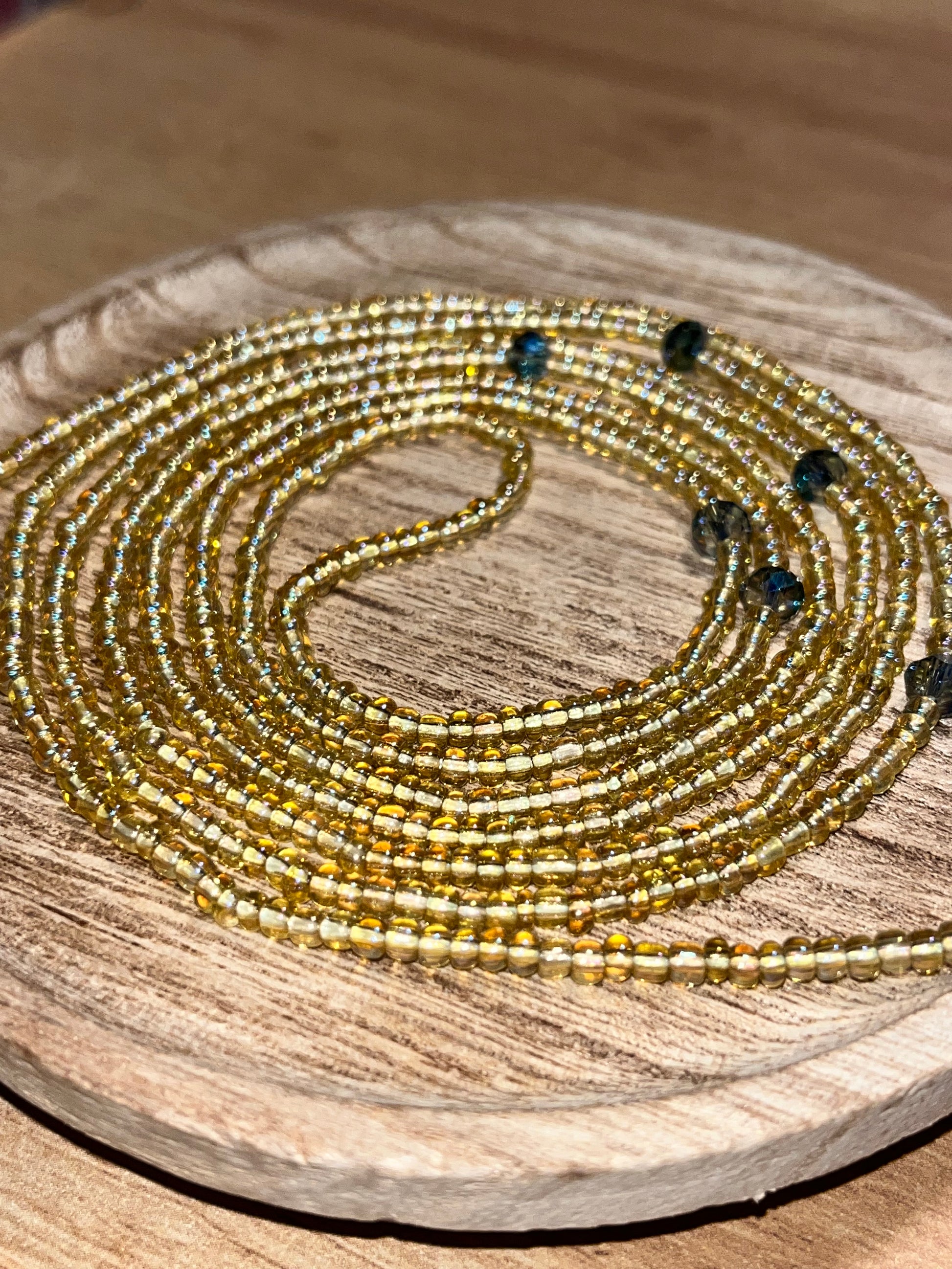 Lux! Beautifully hand strung glass beads, iridescent gold with crystal beads. Adorn your waist today with Lux!