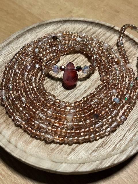 Rose quartz teardrop surrounded by rose quartz Crystal and pink crystal Waist Jewelry! Beautifully hand strung glass beads in a variety of colors. Adorn your waist today with Rose Goddess!