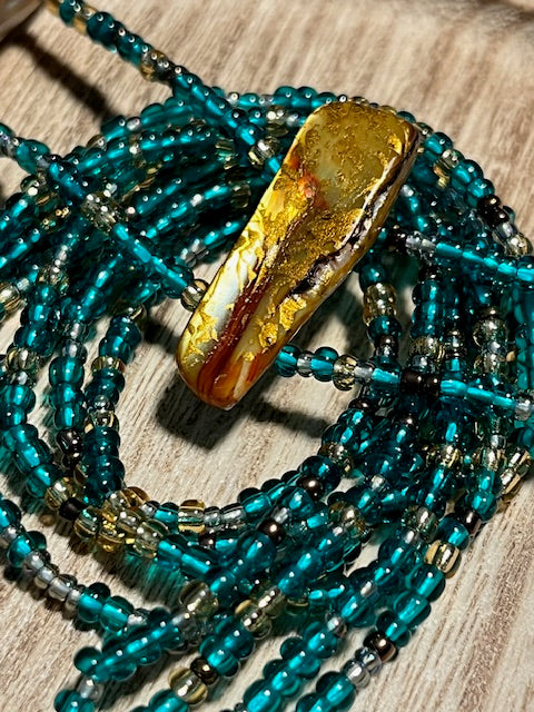 She's Got A Mind of Her Own! Beautiful, double hand strung glass seed beads, in deep Turquoise, gold, and iridescent tones. Featuring amber/gold colored natural stone. Adorn your waist today with She's Got A Mind of Her Own !