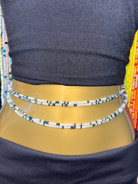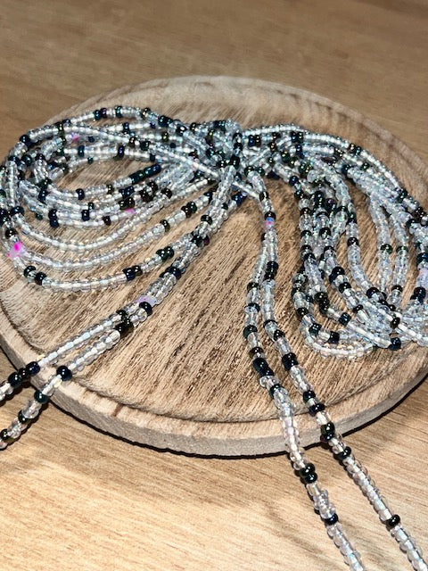 Shimmer! Beautiful, double hand strung glass beads, and crystal beads in iridescent black and white colors, with pink marbled tile beads Adorn your waist today with Shimmer!