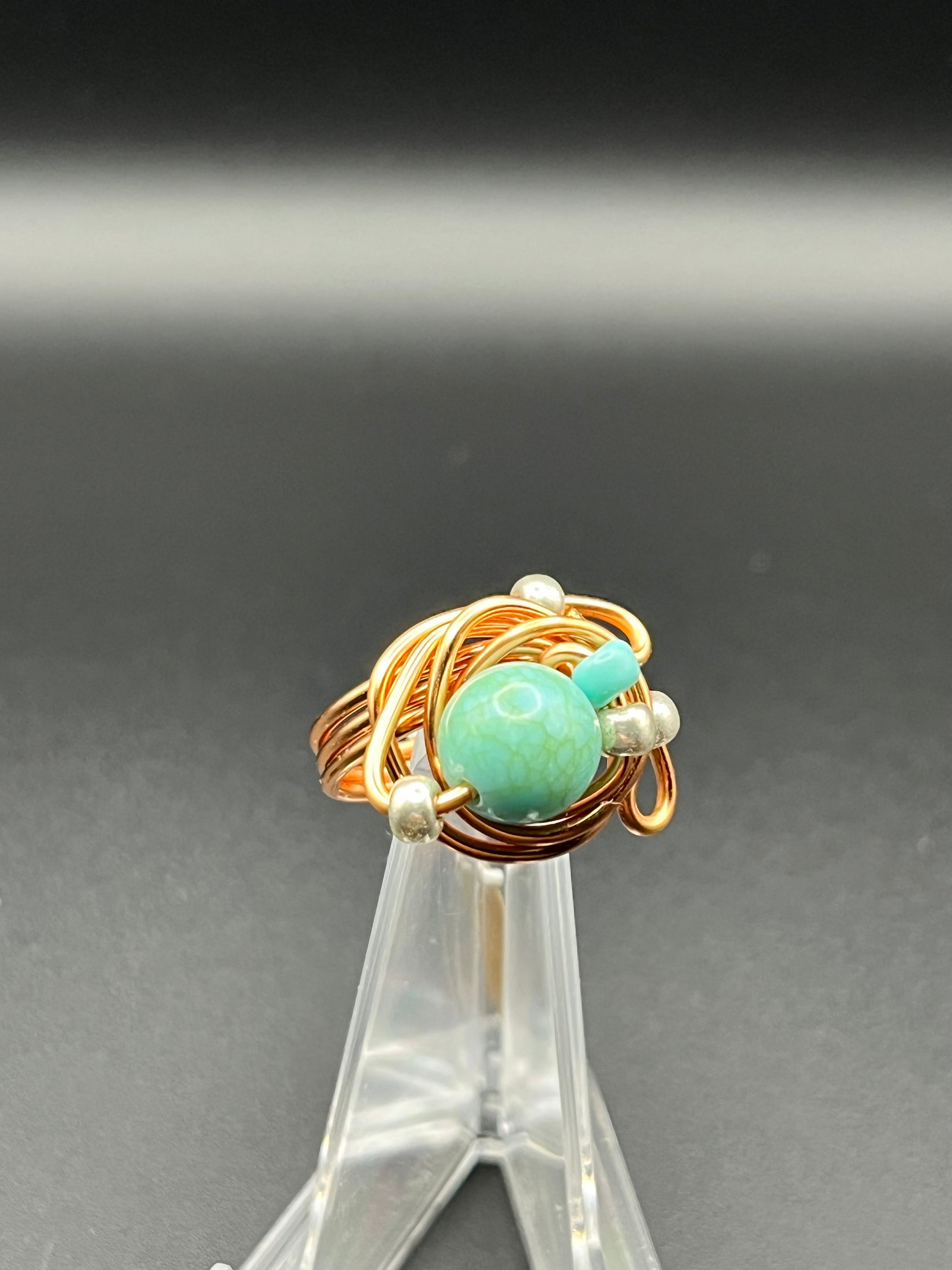 Copper, turquoise colored focal with turquoise and clear accent seed beads
